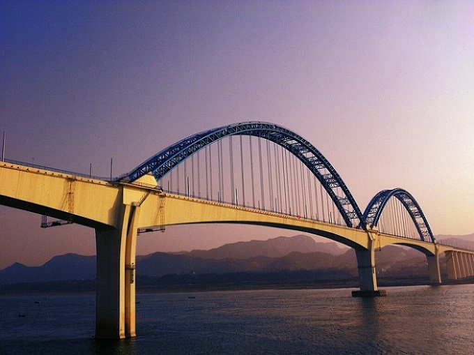 宜萬鐵路宜昌長江大橋位于宜昌港煙收壩水域,全長2527米,橋面設(shè)計為雙軌道,主梁連續(xù)剛構(gòu)跨徑達(dá)275米,在同類型鐵路橋中位居全國第一。拱肋計算跨度264米,為目前國內(nèi)鐵路最大跨度的鋼管混凝土拱。
